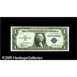 <B>Fr. 1607* $1 1935 Mule Silver Certificate. Choice Crisp Uncirculated.</B></I><BR>One of the true star note rarities, as the serial number range of these Mule stars suggests a very limited production, with few if any obtained by collectors at the time of their release into circulation. We sold a Gem example (the only one we've ever handled) as part of the Fred Thomson collection of $1 Silvers last May, where it realized $6037.50. While this specimen is not quite so perfect, it still should realize somewhere quite close to the Oakes catalogue valuation of $5000 in CU. Lot:15659