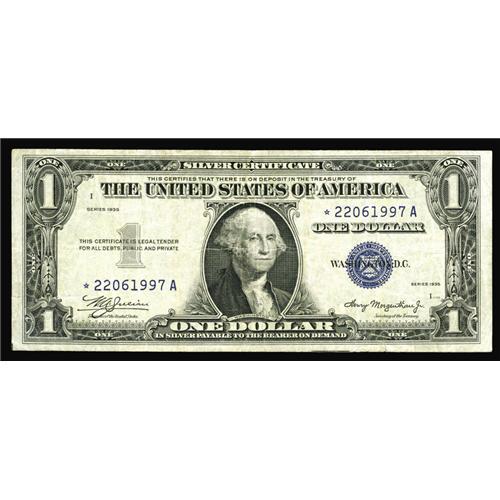 <B>Fr. 1607* $1 1935 Mule Silver Certificate. Fine-Very Fine.</B></I><BR>A decent circulated example of the extremely rare Series 1935 Mule star Silver Certificate. The new Oakes catalogue values this at $1500 in VF, and we can count the number of these stars we have had to offer in all grades during the past fifteen years on the fingers of hand one...and have fingers left over.