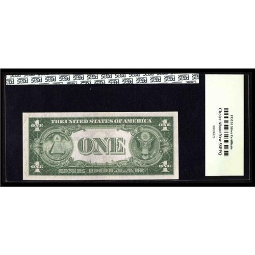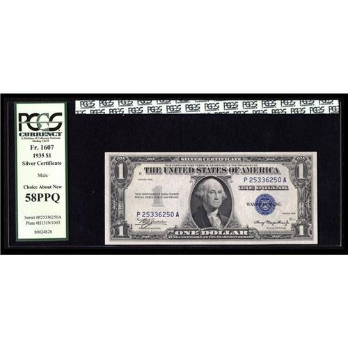 <B>Fr. 1607 $1 1935 Mule Silver Certificate. PCGS Choice About New 58PPQ.</B></I><BR>Unlike most other series, the 1935 Series mules are all very scarce. This attractive piece appears to be every bit of Gem as we can not see any light folds that may have accounted for the grade.