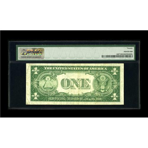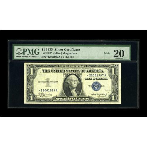 <B>Fr. 1607* $1 1935 Mule Silver Certificate. PMG Very Fine 20.</B></I><BR>A decent circulated example of the extremely rare Series 1935 Mule star Silver Certificate. The new Oakes catalogue values this at $1500 in VF, and we can count the number of these stars we have had to offer in all grades during the past fifteen years on the fingers of hand one...and have fingers left over.<BR><BR><b>Shipping:</b> Coin/Currency (<a target="_blank" href="http://www.heritageauctions.com/common/shipping.php">view shipping information</a>)