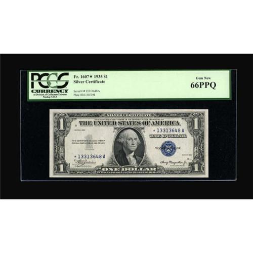 <B>Fr. 1607* $1 1935 Silver Certificate. PCGS Gem New 66PPQ.</B></I><BR> Few surviving examples of this issue boast the margins and the originality of the note offered here tonight.<BR><BR><b>Shipping:</b> Coins & Currency (<a target="_blank" href="http://www.heritageauctions.com/common/shipping.php">view shipping information</a>)