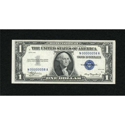 <B>Fr. 1607 $1 1935 Silver Certificate. Very Choice Crisp Uncirculated.</B></I><BR> Low two digit serial number 58 is displayed on this N-A block note.<BR><BR><b>Shipping:</b> Coins & Currency (<a target="_blank" href="http://www.heritageauctions.com/common/shipping.php">view shipping information</a>)