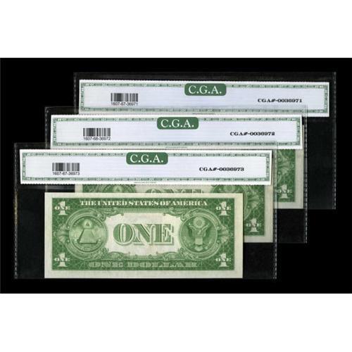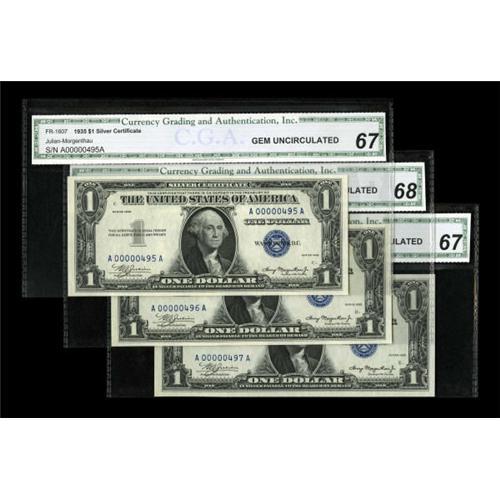 <B>Fr. 1607 $1 1935 Silver Certificates. Three Consecutive Examples CGA Gem Uncirculated 67 & 68.</B></I><BR> This trio of pleasing notes all carry a low three digit serial number from the first block printed for the series.<BR><BR><b>Shipping:</b> Coins & Currency (<a target="_blank" href="http://www.heritageauctions.com/common/shipping.php">view shipping information</a>)