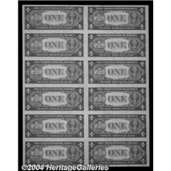 Fr. 1607 $1 1935 Silver Certificates. Uncut Sheet of Twelve. Crisp Uncirculated.This attractive sheet of $1 Silvers bears low three-digit serial number A00000985A through A00000996A. There is a light moisture stain that affects portions of five notes on the sheet, while the other seven notes are Gems. Less than 30 examples are listed in the most current census, and surviving uncut sheets certainly do not show up with any regularity. <BR><BR><B>Important notice:</B> Heritage usually auctions material at the rate of 200-250 lots per hour. On some occasions eBay Live bid software or the Internet may not be able to keep up with the pace of the auction. We recommend placing a realistic absentee bid now as insurance to avoid disappointment. Occasionally the auctioneer may eliminate or reject an eBay Live bid, and the auctioneer may also reopen a lot after the close of the eBay live bidding (usually because we missed an audience bid), and may reject your bid even if it shows you as the winning bidder. By bidding via eBay Live, you agree that Heritage may award the lot to another bidder at its sole discretion under the circumstances described above or any other reasonable circumstances. Since eBay bids are not shown to us until we open the lot on the floor, we treat those bids just like floor bids. In most cases the floor responds before the eBay bid is presented to us, due to Internet lag time, so for consistency we have made it a policy that floor bids are always considered first over tie eBay live bids. Also please note that all Heritage lots purchased through eBay Live carry a 20% Buyer's Premium. Please make sure you read the Terms and Conditions before you bid. <BR><BR><B>IMPORTANT ANNOUNCEMENT ABOUT RESERVES:</B> Heritage now divulges all reserves on its web site 7 days before every auction. If you want to know whether the reserve on this lot has been met, and if not, what the reserve amount is, please visit this lot page on the HeritageCoin.com web site, or email: bid@HeritageGalleries.com