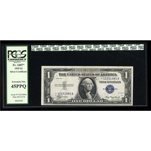 <B>Fr. 1607* $1 1935 Silver Certificate. PCGS Extremely Fine 45PPQ.</B></I><BR>Some bends are noticed within the holder on this otherwise crisp replacement.
