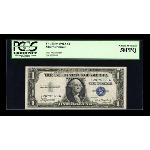 <B>Fr. 1608* $1 1935A Mule Silver Certificate. PCGS Choice About New 58PPQ.</B></I><BR> Paper wave and embossing are observed on this Mule star with micro back plate number 828.<BR><I>From The Drew Keough Collection</B></I><BR><BR><b>Shipping:</b> Coins & Currency (<a target="_blank" href="http://www.heritageauctions.com/common/shipping.php">view shipping information</a>)