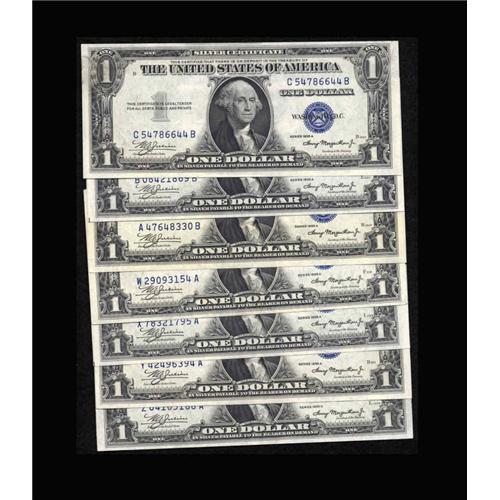 <B>Fr. 1608 $1 1935A Mule Silver Certificates. Seven Examples</B></I><BR>This lot contains high grade seldom seen examples of these mixed plate size notes. The W-A is <B>AU,</B></I> the X-A is <B>XF,</B></I> the Y-A is <B>AU</B></I> with a pinhole, the Z-A is <B>VF+,</B></I> the A-B is <B>CU+,</B></I> the B-B is <B>XF-AU,</B></I> and the C-B is <B>CU</B></I> with light soiling at upper left.<BR>