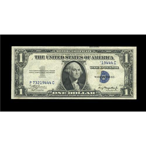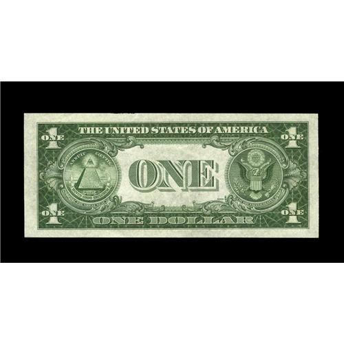 <B>Fr. 1608 $1 1935A Silver Certificate. Choice About Uncirculated.</B></I><BR>A neat obstruction affects the third print on this Blue Seal which exhibits a faint soft corner fold.