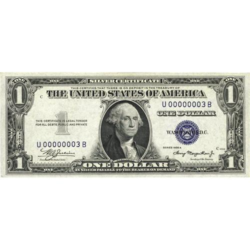 <B>Fr. 1608 $1 1935A Silver Certificate. Choice Crisp Uncirculated.</B></I><BR>Serial U00000003B and just a tiny corner bend at lower right away from a still higher grade.