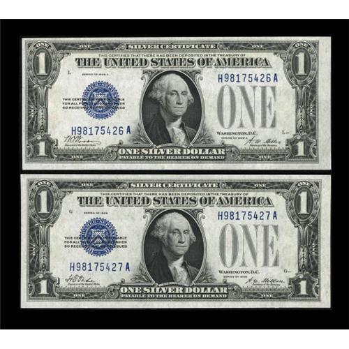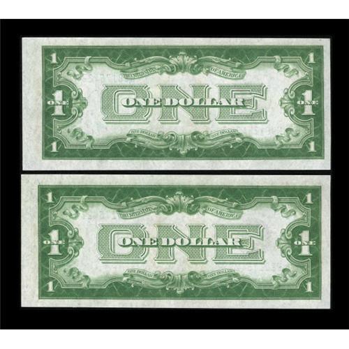 <B>Fr. 1601/Fr. 1600 $1 1928A/1928 Silver Certificates. Reverse Changeover Pair. Choice Crisp Uncirculated.</B></I><BR> This Reverse Changeover Pair is only a few thousand serial numbers away from the regular Changeover Pair also available here.<BR><I>From The Drew Keough Collection</B></I><BR><BR><b>Shipping:</b> Coins & Currency (<a target="_blank" href="http://www.heritageauctions.com/common/shipping.php">view shipping information</a>)