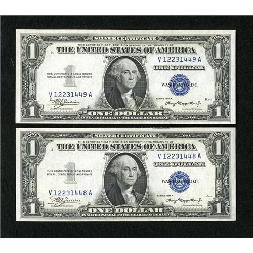 <B>Fr. 1608 Consecutive Pair of $1 1935A Mule Silver Certificates. Very Choice Crisp Uncirculated.</B></I><BR>A consecutive pair of near gem mules from the scarcer V-A block which lists for $60 each in the new Schwartz 7th edition.<BR><BR><b>Shipping:</b> Coins & Currency (<a target="_blank" href="http://www.heritageauctions.com/common/shipping.php">view shipping information</a>)