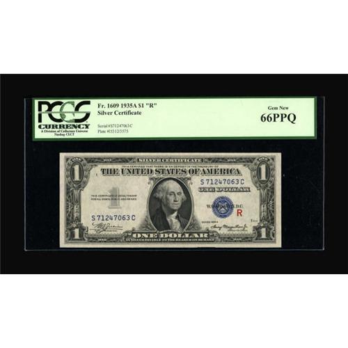 <B>Fr. 1609 $1 1935A R Silver Certificate. PCGS Gem New 66PPQ.</B></I><BR> The difference in the experimental paper quality is clearly evident when "R" and "S" notes are compared side by side. This piece is a perfect match to the well margined 66PPQ also offered in this auction. <BR><BR><b>Shipping:</b> Coins & Currency (<a target="_blank" href="http://www.heritageauctions.com/common/shipping.php">view shipping information</a>)