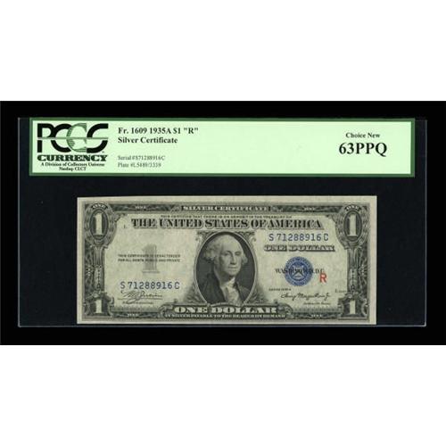 <B>Fr. 1609 $1 1935A R Silver Certificate. PCGS Choice New 63PPQ.</B></I><BR> Bright surfaces add to the eye appeal of this note with slight margin issues.<BR><I>From The Thomas A. Bergin Collection</B></I><BR><BR><b>Shipping:</b> Coins & Currency (<a target="_blank" href="http://www.heritageauctions.com/common/shipping.php">view shipping information</a>)