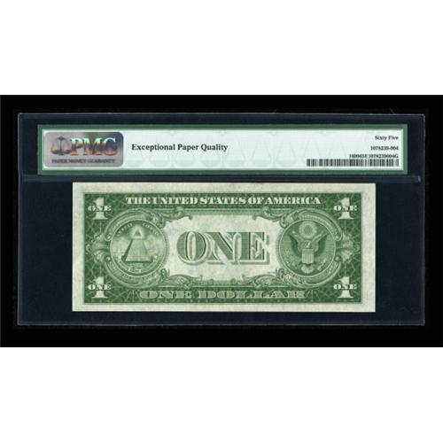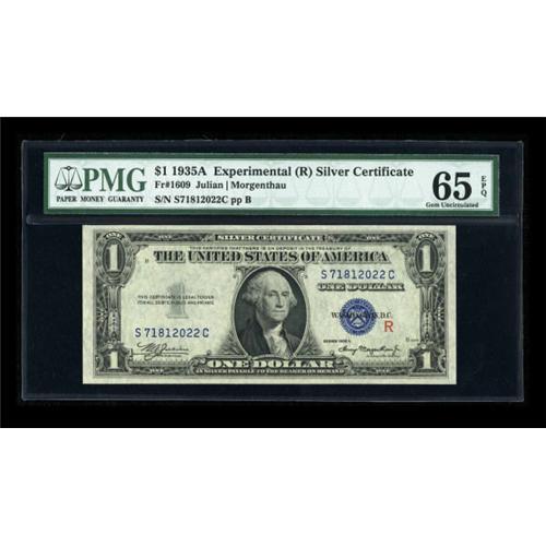 <B>Fr. 1609 $1 1935A R Silver Certificate. PMG Gem Uncirculated 65 EPQ.</B></I><BR> This experimental would make a nice pair with the gem "S" below. Pack fresh with bright colors and deep embossing.<BR><I>From The Warren Marshall Collection</B></I><BR><BR><b>Shipping:</b> Coins & Currency (<a target="_blank" href="http://www.heritageauctions.com/common/shipping.php">view shipping information</a>)