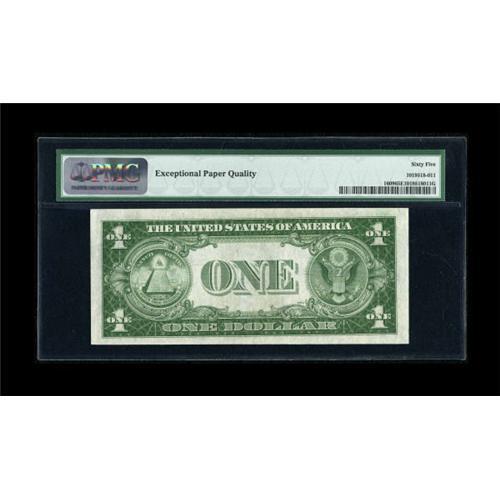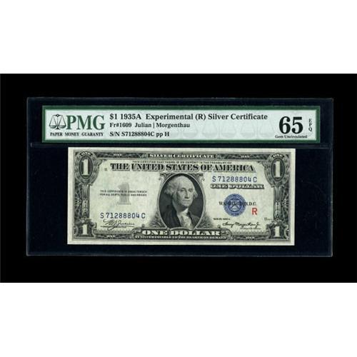 <B>Fr. 1609 $1 1935A R Silver Certificate. PMG Gem Uncirculated 65 EPQ.</B></I><BR> This example would pair up well with the similarly graded "S" note offered here. Wonderful centering and deep inks abound on this fresh note.<BR><BR><b>Shipping:</b> Coins & Currency (<a target="_blank" href="http://www.heritageauctions.com/common/shipping.php">view shipping information</a>)