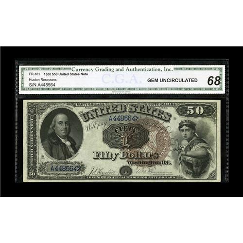 <B>Fr. 161 $50 1880 Legal Tender CGA Gem Uncirculated 68.</B></I> This is the highest third-party graded note we have ever had for this Friedberg number. It is a beautiful example with ample margins, pinpoint centering, and nice face to back registration. All this adds up to one great note.<BR><BR><b>Shipping:</b> Coin/Currency (<a target="_blank" href="http://www.heritageauctions.com/common/shipping.php">view shipping information</a>)