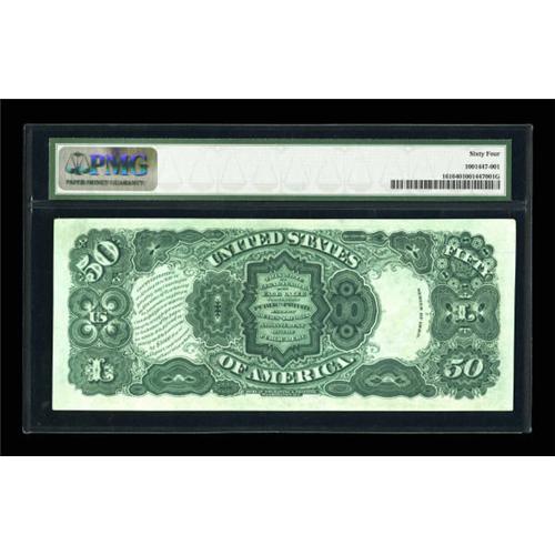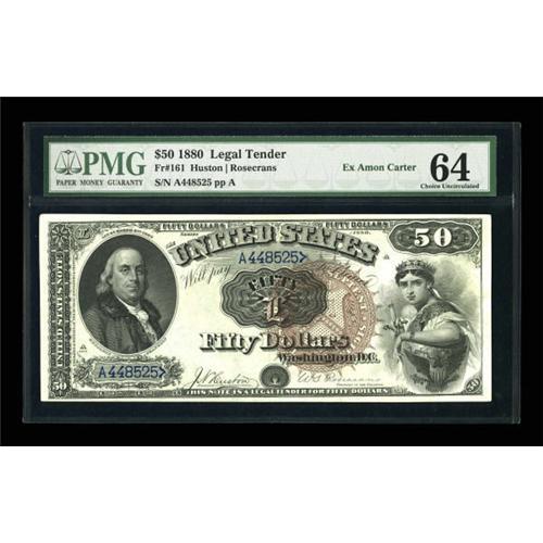 <B>Fr. 161 $50 1880 Legal Tender PMG Choice Uncirculated 64.</B></I> Fr. 161 is the basic "Type Note" of the Large Seal Fifty Dollar Legals. There is a fairly long run of nice Uncirculated notes that have supplied generations of collectors with bright, broad-margined, handsome type notes. This note is from that run. PMG has noted on the holder that prior to being the Dauer example, this piece had been in the collection of Amon Carter. Though not the note pictured, it is illustrated on page 115 of the Dauer reference book. <BR><I>From The Dr. Edward & Joanne Dauer Collection</B></I><BR><BR><b>Shipping:</b> Coins & Currency (<a target="_blank" href="http://www.heritageauctions.com/common/shipping.php">view shipping information</a>)