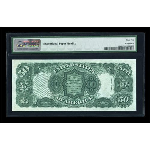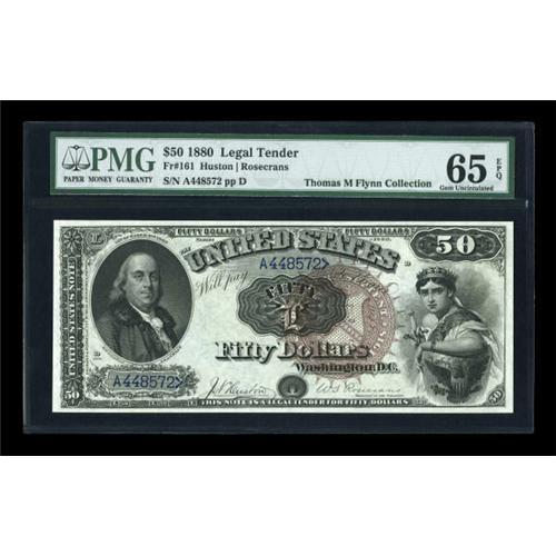 <B>Fr. 161 $50 1880 Legal Tender PMG Gem Uncirculated 65 EPQ.</B></I> This Large Brown Seal $50 Legal has been awarded PMG's coveted "Exceptional Paper Quality," comment. That, added to its numerical grade, spectacular color and broad margins should create tremendous bidder interest in this note. Two others in this grade have recent auction records: another PMG 65 that realized over $25,000 in our January '07 sale, and yet another that realized $26,300 in January of '08. PMG has graded six Fr. 161's at this 65EPQ level. All have likely come from the same serial-number run as this note. That run has supplied generations of collectors with high-grade examples of this type, and save for that run, there would be virtually none. Of the 62 Fr. 161's known, only sixteen of them are <I>not </B></I>from this run, and none of those sixteen is high-grade.<BR><I>From The Thomas M. Flynn Collection</B></I><BR><BR><b>Shipping:</b> Coins & Currency (<a target="_blank" href="http://www.heritageauctions.com/common/shipping.php">view shipping information</a>)