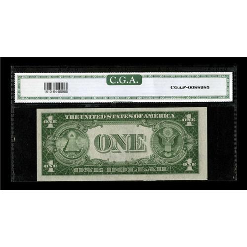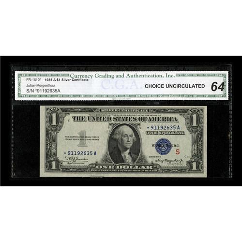 <B>Fr. 1610* $1 1935A S Silver Certificate. CGA Choice Uncirculated 64.</B></I><BR>Pleasing paper quality is noted through the third party holder as is the embossing.<BR><BR><b>Shipping:</b> Coins & Currency (<a target="_blank" href="http://www.heritageauctions.com/common/shipping.php">view shipping information</a>)
