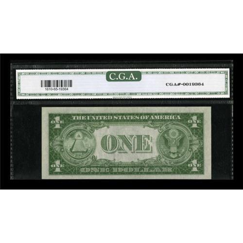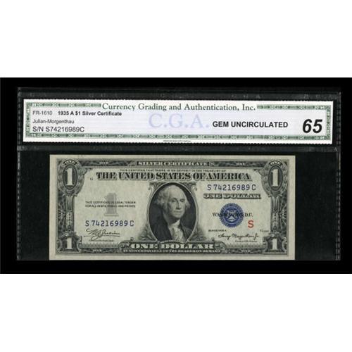 <B>Fr. 1610 $1 1935A S Silver Certificate. CGA Gem Uncirculated 65.</B></I><BR> Broad margins and pleasing paper waves are noted on this Gem Experimental.<BR><BR><b>Shipping:</b> Coins & Currency (<a target="_blank" href="http://www.heritageauctions.com/common/shipping.php">view shipping information</a>)