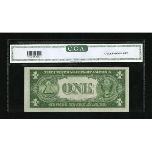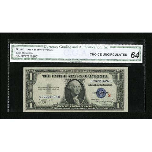 <B>Fr. 1610 $1 1935A S Silver Certificate. CGA Choice Uncirculated 64.</B></I><BR> A delightful example of this "S" experimental that appears to have excellent color and bold printing. There are a couple of "as made" paper wrinkles that do not affect the grade.<BR><BR><b>Shipping:</b> Coins & Currency (<a target="_blank" href="http://www.heritageauctions.com/common/shipping.php">view shipping information</a>)