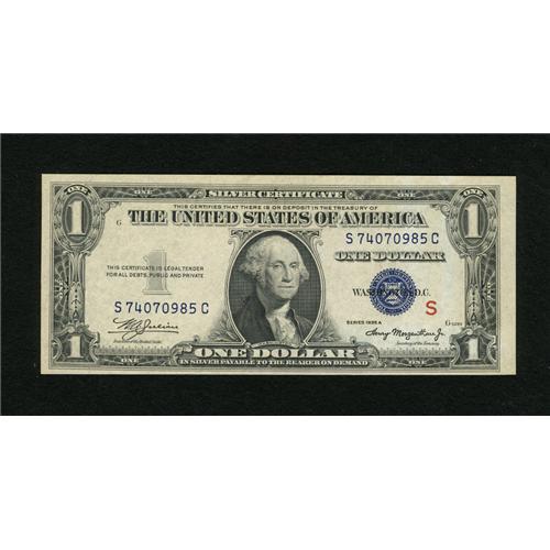 <B>Fr. 1610 $1 1935A S Silver Certificate. Choice Crisp Uncirculated.</B></I><BR>This is an attractive and original example of this "S" experimental that is printed on the typical darker paper with omnipresent embossing attesting to its originality.<BR><BR><b>Shipping:</b> Coins & Currency (<a target="_blank" href="http://www.heritageauctions.com/common/shipping.php">view shipping information</a>)