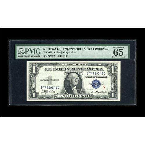 <B>Fr. 1610 $1 1935A "S" Silver Certificate. PMG Gem Uncirculated 65 EPQ.</B></I><BR>Wide margins and embossing are noticed through the third-party holder that expresses "Exceptional Paper Quality."