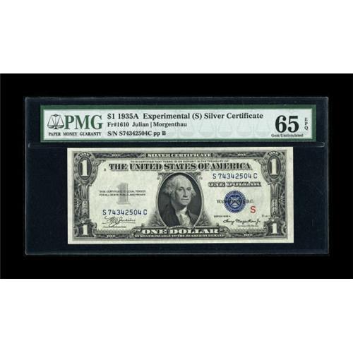 <B>Fr. 1610 $1 1935A S Silver Certificate. PMG Gem Uncirculated 65 EPQ.</B></I><BR> Wonderful centering and plenty of in your face embossing highlight this crackling fresh note.<BR><BR><b>Shipping:</b> Coins & Currency (<a target="_blank" href="http://www.heritageauctions.com/common/shipping.php">view shipping information</a>)