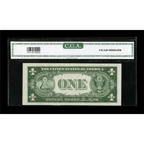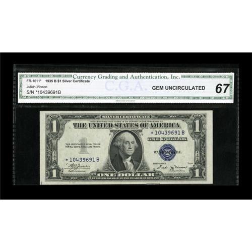 <B>Fr. 1611* $1 1935B Silver Certificate. CGA Gem Uncirculated 67.</B></I><BR> A high grade example of a popular replacement note.<BR><BR><b>Shipping:</b> Coins & Currency (<a target="_blank" href="http://www.heritageauctions.com/common/shipping.php">view shipping information</a>)