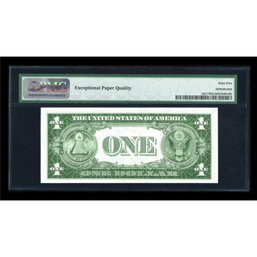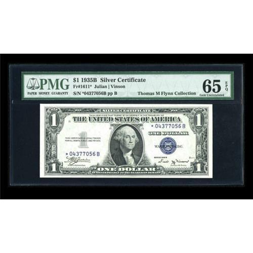 <B>Fr. 1611* $1 1935B Silver Certificate. PMG Gem Uncirculated 65 EPQ.</B></I><BR> Bright, well centered, and a lovely star in all respects. <BR><I>From The Thomas M. Flynn Collection</B></I><BR><BR><b>Shipping:</b> Coins & Currency (<a target="_blank" href="http://www.heritageauctions.com/common/shipping.php">view shipping information</a>)