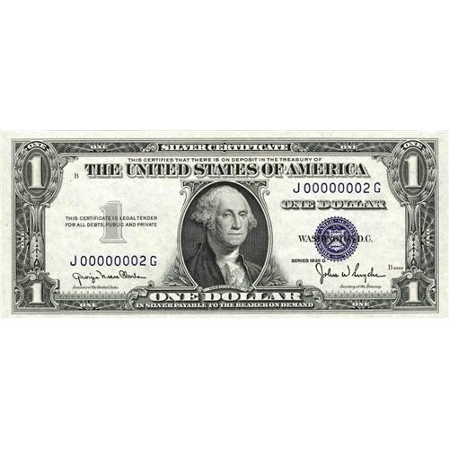 <B>Fr. 1613N $1 1935D Silver Certificate. Gem Crisp Uncirculated.</B></I><BR>Pristine paper surfaces and superior centering make this two digit serial J00000002G a candidate for encapsulation as a 66 or better.