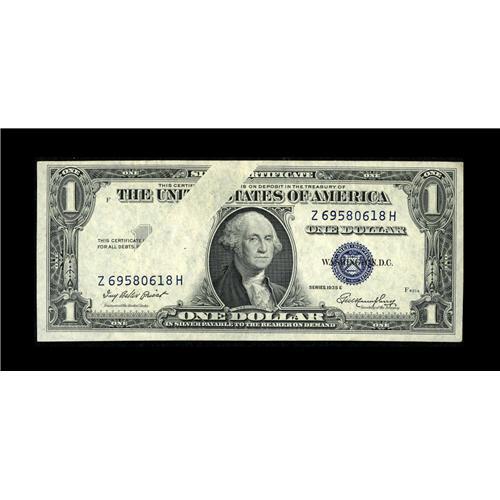 <B>Fr. 1614 $1 1935E Silver Certificate. About Uncirculated.</B></I><BR>A large rectangle obstruction area is found on this $1 Silver.<BR><BR><b>Shipping:</b> Coin/Currency (<a target="_blank" href="http://www.heritageauctions.com/common/shipping.php">view shipping information</a>)