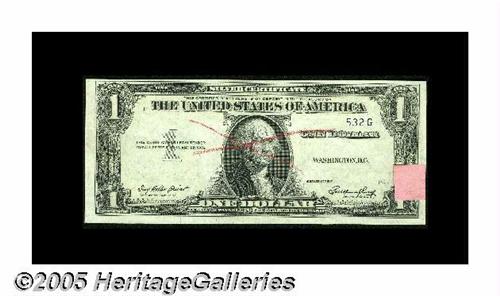 <B>Fr. 1614 $1 1935E Silver Certificate. Choice Crisp Uncirculated.</B></I> The third printing is lacking all but three digits and a prefix letter on this $1 Silver. A BEP inspector has marked this note in red crayon, and he has also applied a pink rejection sticker to the lower right-hand corner. Despite his efforts, this note was still able to escape into the channels of commerce.