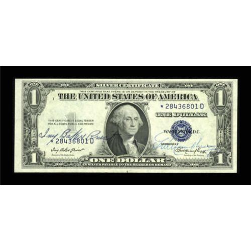 <B>Fr. 1614* $1 1935E Silver Certificate Dual Courtesy Autograph. Very Choice Crisp Uncirculated.</B></I><BR> Both signers have graciously applied their autographs above their engraved signatures on this replacement note.<BR><BR><b>Shipping:</b> Coins & Currency (<a target="_blank" href="http://www.heritageauctions.com/common/shipping.php">view shipping information</a>)