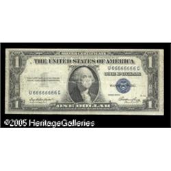 <B>Fr. 1614 $1 1935E Silver Certificate. Fine.</B></I><BR>Serial number U666666666G is carried by this $1 Silver that shows some wear along the lateral center fold in the portrait. Lot:15685