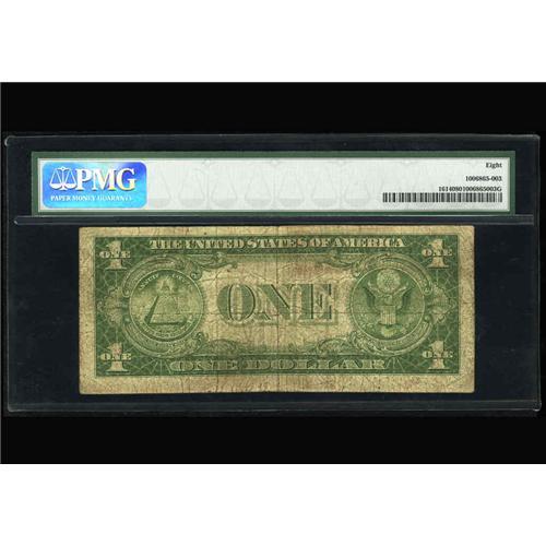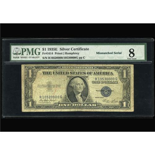 <B>Fr. 1614 $1 1935E Silver Certificate. PMG Very Good 8.</B></I><BR>Here is a neat single digit mismatch that causes an even 10,000 number difference between the two serial numbers.