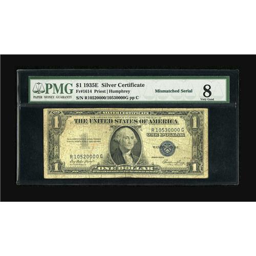 <B>Fr. 1614 $1 1935E Silver Certificate. PMG Very Good 8.</B></I><BR>This is a fancy serial number mismatch that carries five zeroes in the serial.<BR><BR><b>Shipping:</b> Coin/Currency (<a target="_blank" href="http://www.heritageauctions.com/common/shipping.php">view shipping information</a>)