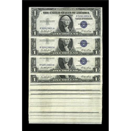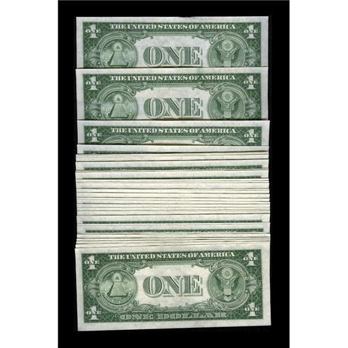 <B>Fr. 1614 $1 1935E Silver Certificates. Fifty Consecutive Examples. Choice Crisp Uncirculated.</B></I><BR>This first half of a pack has three broad margins and a tight top margin. Many of the notes exhibit a portion of a paper guide line marker in the lower right-hand corner.<BR><BR><b>Shipping:</b> Coins & Currency (<a target="_blank" href="http://www.heritageauctions.com/common/shipping.php">view shipping information</a>)