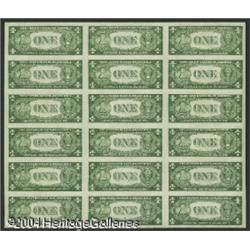 Fr. 1614 $1 1935E Silver Certificates. Uncut Sheet of 1 <B>Fr. 1614 $1 1935E Silver Certificates. Uncut Sheet of 18. Choice Crisp Uncirculated.</B></I><BR>This sheet is kept from Gem status by the presence of a storage pinch affecting the two upper right hand notes, but is otherwise free from any distractions. It is bright and attractive. We believe that uncut sheets of small size notes represent a superior value in today's market and are substantially undervalued in terms of their scarcity. It is likely that within a few years the price paid tonight will be wistfully looked back at with the nostalgic reflection that "old time prices" have traditionally engendered in the collecting fraternity. <BR><BR><B>Important notice:</B> Heritage usually auctions material at the rate of 200-250 lots per hour. On some occasions eBay Live bid software or the Internet may not be able to keep up with the pace of the auction. We recommend placing a realistic absentee bid now as insurance to avoid disappointment. Occasionally the auctioneer may eliminate or reject an eBay Live bid, and the auctioneer may also reopen a lot after the close of the eBay live bidding (usually because we missed an audience bid), and may reject your bid even if it shows you as the winning bidder. By bidding via eBay Live, you agree that Heritage may award the lot to another bidder at its sole discretion under the circumstances described above or any other reasonable circumstances. Since eBay bids are not shown to us until we open the lot on the floor, we treat those bids just like floor bids. In most cases the floor responds before the eBay bid is presented to us, due to Internet lag time, so for consistency we have made it a policy that floor bids are always considered first over tie eBay live bids. Also please note that all Heritage lots purchased through eBay Live carry a 20% Buyer's Premium. Please make sure you read the Terms and Conditions before you bid. This lot is being auctioned in conjunction with a live floor auction by Heritage Galleries & Auctioneers. All final auction and invoice information will be supplied by Heritage Galleries & Auctioneers, and all other information should be considered preliminary. Lot:16233