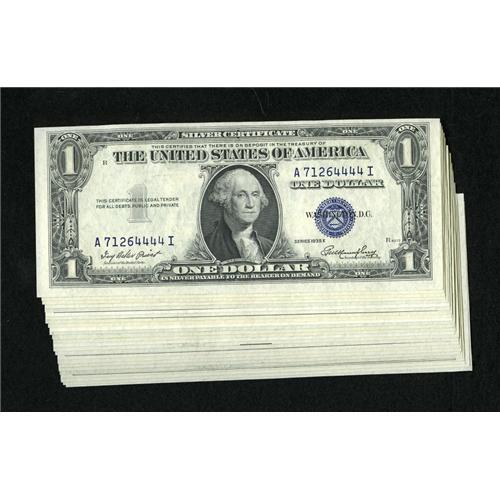 <B>Fr. 1614/1615 Twenty-Five $1 1935E/1935F Silver Certificates. Choice Crisp Uncirculated or better.</B></I><BR>An impressive run of twenty-five notes ranging from the 1935E Series A-I through P-I and then continuing with the 1935F Series Q-I through Z-I. Except for a cornerfold on the first note they are all crackling fresh Choice CU or better notes.<BR><BR><BR><b>Shipping:</b> Coins & Currency (<a target="_blank" href="http://www.heritageauctions.com/common/shipping.php">view shipping information</a>)