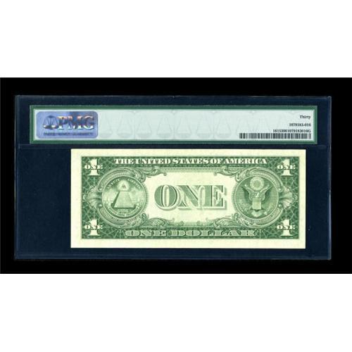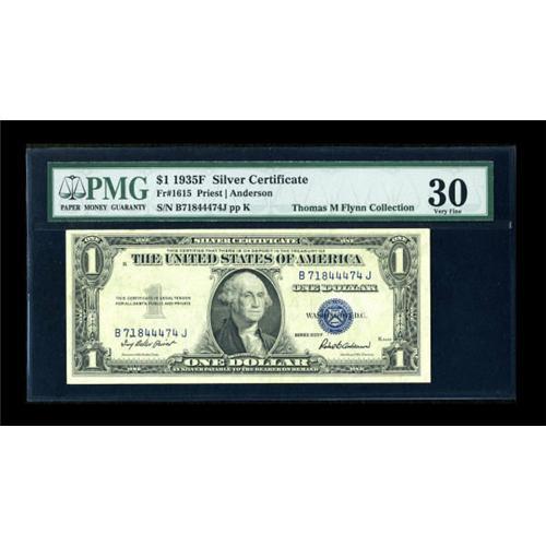 <B>Fr. 1615 $1 1935F Silver Certificate. B-71J Block. PMG Very Fine 30.</B></I><BR> This block was a special run of 360,000 pieces that were released in New Orleans without fanfare. Few were saved, and uncirculated examples are truly scarce. <BR><I>From The Thomas M. Flynn Collection</B></I><BR><BR><b>Shipping:</b> Coins & Currency (<a target="_blank" href="http://www.heritageauctions.com/common/shipping.php">view shipping information</a>)