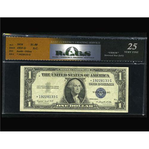 <B>Fr. 1616 $1 1935G Silver Certificate. RCGS Very Fine 25.</B></I> A certified note with the left star very clearly inverted. Star note errors are eagerly sought by devotees of this specialty area and we expect this certified example will generate bids of no less than...