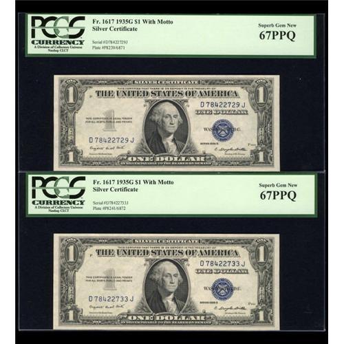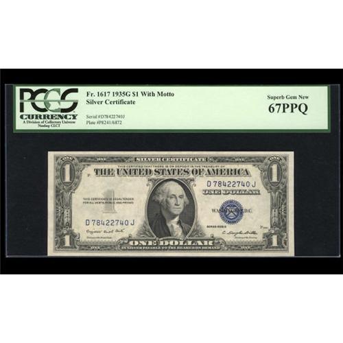 <B>Fr. 1617 $1 1935G With Motto Silver Certificate. PCGS Superb Gem New 67PPQ.</B></I><BR> A trio of perfectly margined "With Motto" Aces.<BR><BR><b>Shipping:</b> Coins & Currency (<a target="_blank" href="http://www.heritageauctions.com/common/shipping.php">view shipping information</a>)