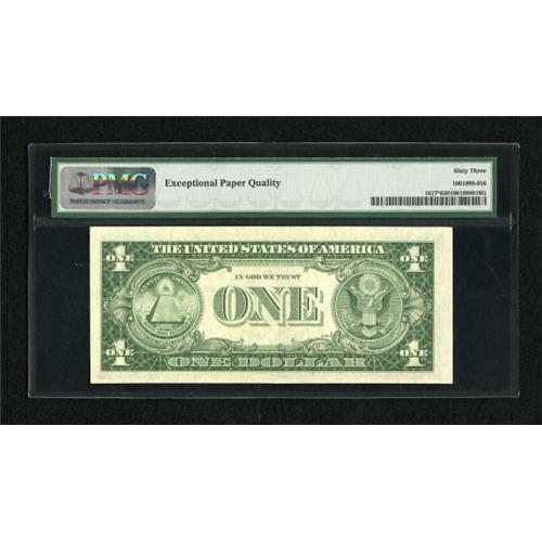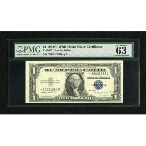 <B>Fr. 1617* $1 1935G With Motto Silver Certificate. PMG Choice Uncirculated 63 EPQ.</B></I><BR> This is a lovely example of this much scarcer With Motto star note that has three huge margins and a plethora of original embossing.<BR><BR><b>Shipping:</b> Coins & Currency (<a target="_blank" href="http://www.heritageauctions.com/common/shipping.php">view shipping information</a>)