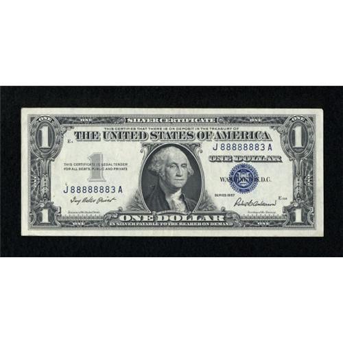 <B>Special Serial Number Fr. 1619 $1 1957 Silver Certificate. About Uncirculated.</B></I><BR> This lightly handled silver ace comes with an attractive serial number of J88888883A along with a couple of staple holes.<BR><BR><b>Shipping:</b> Coins & Currency (<a target="_blank" href="http://www.heritageauctions.com/common/shipping.php">view shipping information</a>)