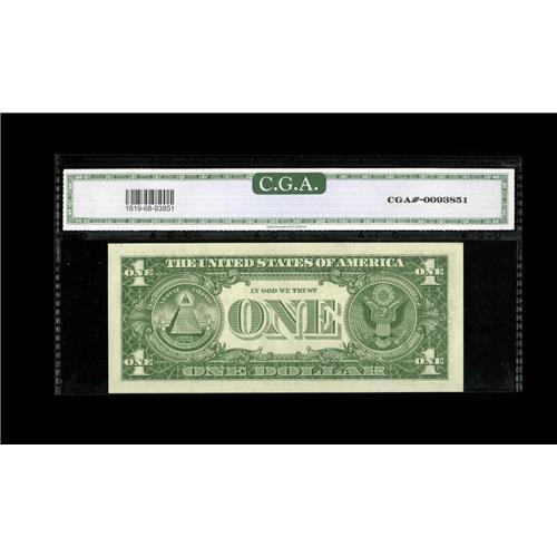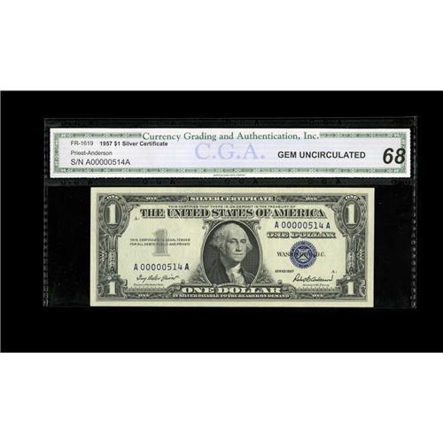 <B>Fr. 1619 $1 1957 Silver Certificate. CGA Gem Uncirculated 68.</B></I><BR>Perfectly new with the appealing serial number A00000514A.