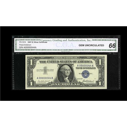 <B>Fr. 1619 $1 1957 Silver Certificate. CGA Gem Uncirculated 66.</B></I><BR>A bold Gem with an all appealing serial number, A00000044A.