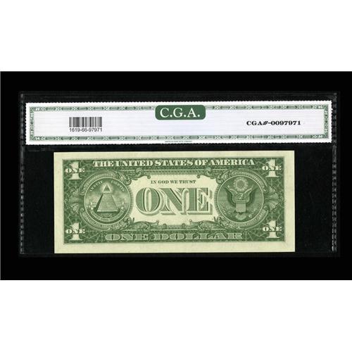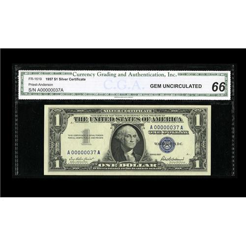 <B>Fr. 1619 $1 1957 Silver Certificate. CGA Gem Uncirculated 66.</B></I><BR>The two digit serial number A00000037A graces this note.