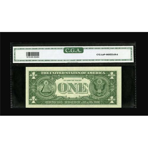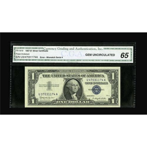 <B>Fr. 1621 $1 1957B Silver Certificate. CGA Gem Uncirculated 65.</B></I><BR> An original example of the popular U37/U47 mismatch incorrectly attributed as a Fr. 1619 on the holder.<BR><BR><b>Shipping:</b> Coins & Currency (<a target="_blank" href="http://www.heritageauctions.com/common/shipping.php">view shipping information</a>)