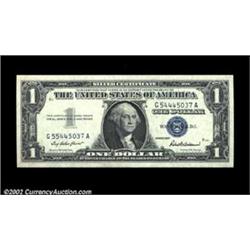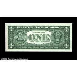 Fr. 1619 $1 1957 Silver Certificate. Gem Crisp Uncirculated. Mismatched serial numbers G55445037A/G54445037A. Important notice: We expect to be auctioning lots at the rate of 200-250 per hour. Sometimes eBay Premier live bid software cannot keep up with that pace, so we strongly recommend that you place a realistic proxy bid now as insurance to avoid disappointment. Also please note that all Heritage/CAA lots purchased through eBay Premier carry a 20% Buyer's Premium. Please make sure you read the Terms and Conditions.